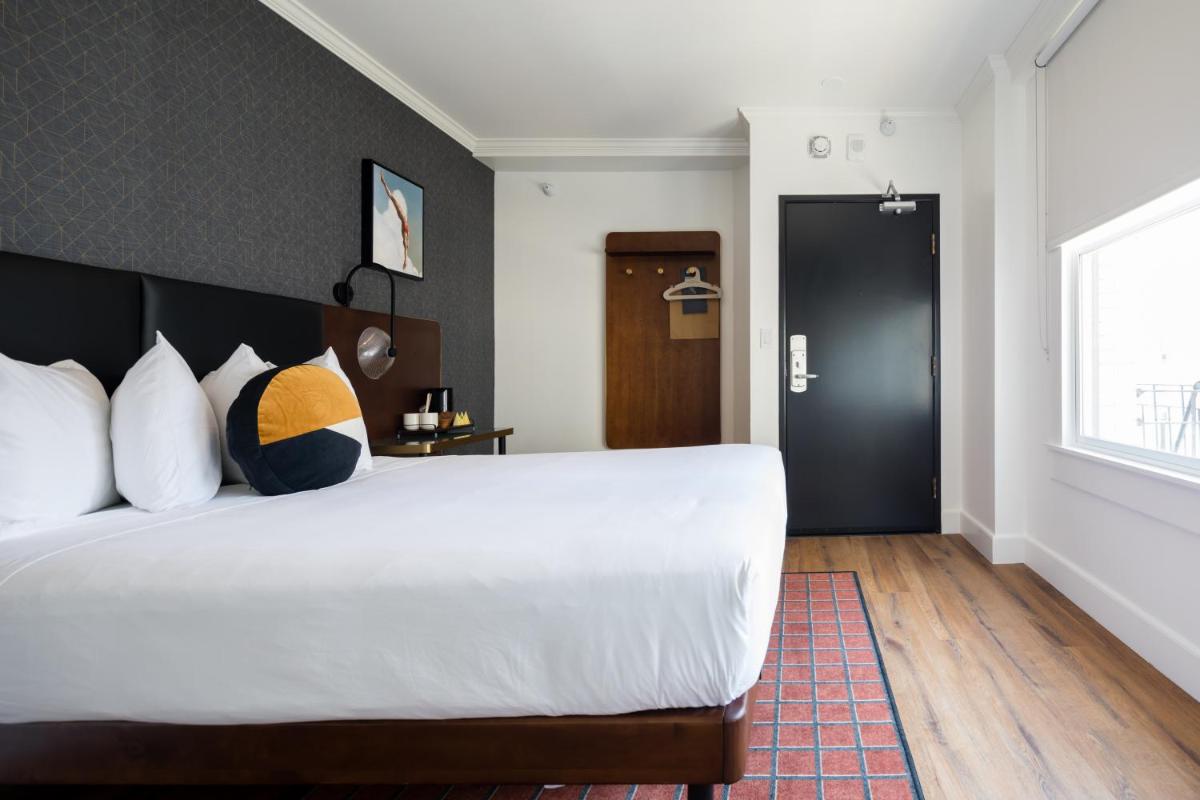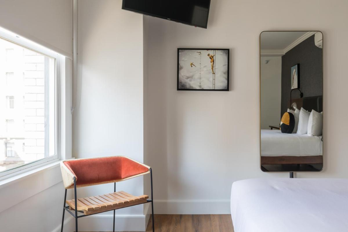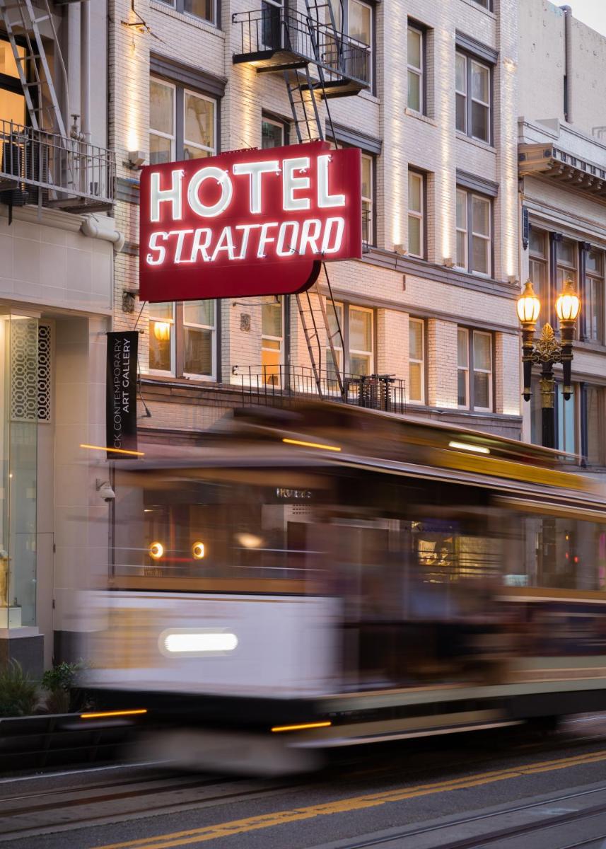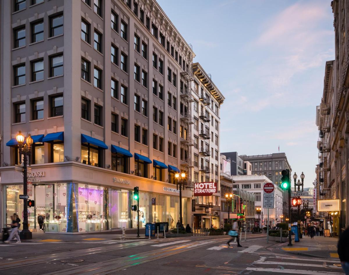The gallery highlights Hotel Stratford San Francisco’s historic interiors, compact guest rooms, and its iconic Powell Street frontage. Images focus on simple room layouts, clean furnishings, and practical amenities such as work surfaces and televisions. Exterior photos emphasize the unbeatable Union Square location, with cable cars and pedestrian traffic right outside the entrance. Together, the gallery provides a realistic snapshot of what guests can expect—straightforward accommodations framed by one of the city’s most active neighborhoods.