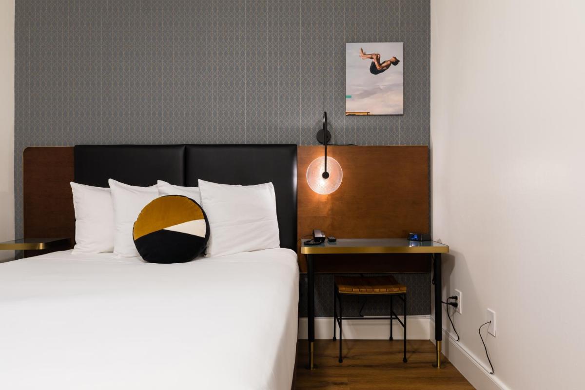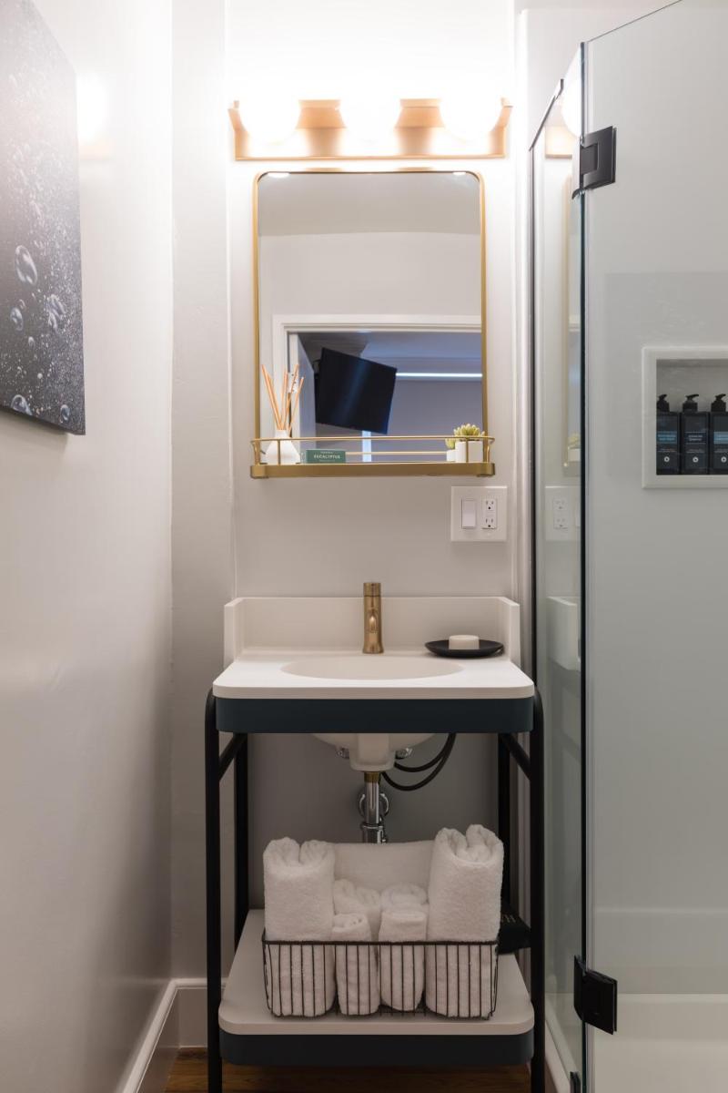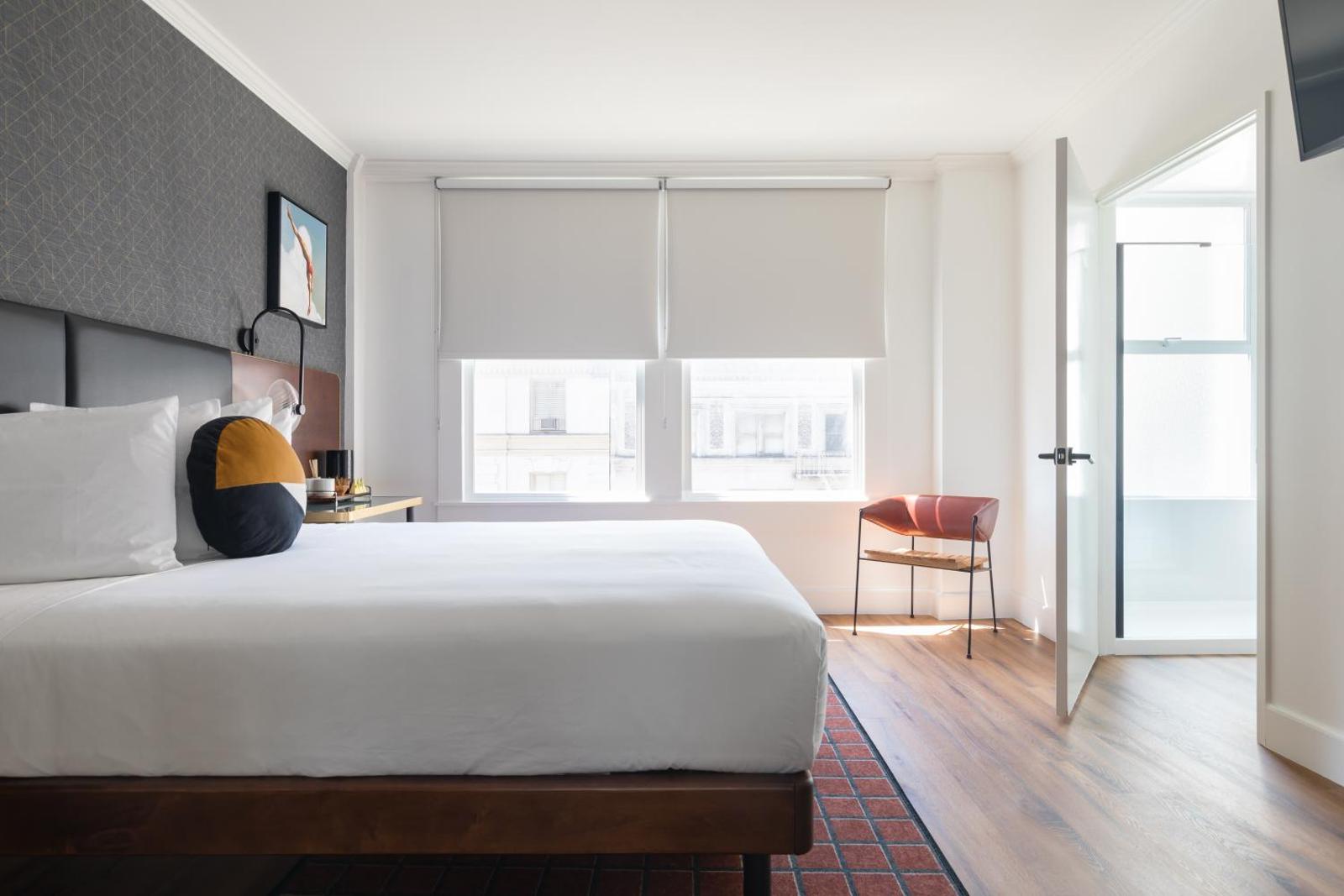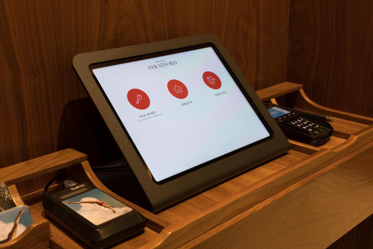 The gallery highlights Hotel Stratford San Francisco’s historic interiors, compact guest rooms, and its iconic Powell Street frontage. Images focus on simple room layouts, clean furnishings, and practical amenities such as work surfaces and televisions. Exterior photos emphasize the unbeatable Union Square location, with cable cars and pedestrian traffic right outside the entrance. Together, the gallery provides a realistic snapshot of what guests can expect—straightforward accommodations framed by one of the city’s most active neighborhoods.
